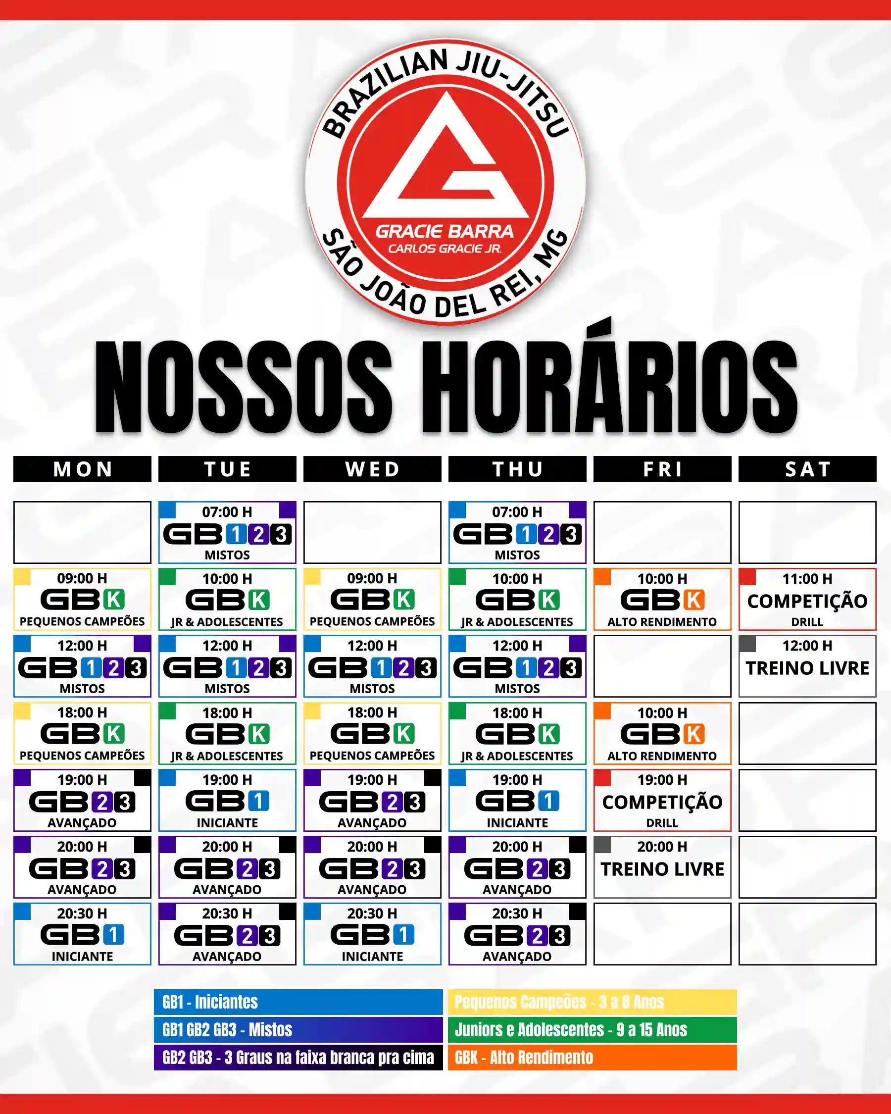 Entendemos que a vida pode ser corrida, mas com nossa agenda flexível, você pode facilmente encontrar um horário que se encaixe na sua rotina diária e na da sua família. Seja para embarcar na sua própria jornada no Jiu-Jitsu ou apresentar a arte ao seu filho, oferecemos uma variedade de horários de aula que se adaptam perfeitamente a qualquer agenda. Aproveite a oportunidade para agendar uma aula na Gracie Barra, o lugar ideal para crescer, aprender e se desenvolver em um ambiente seguro e acolhedor.